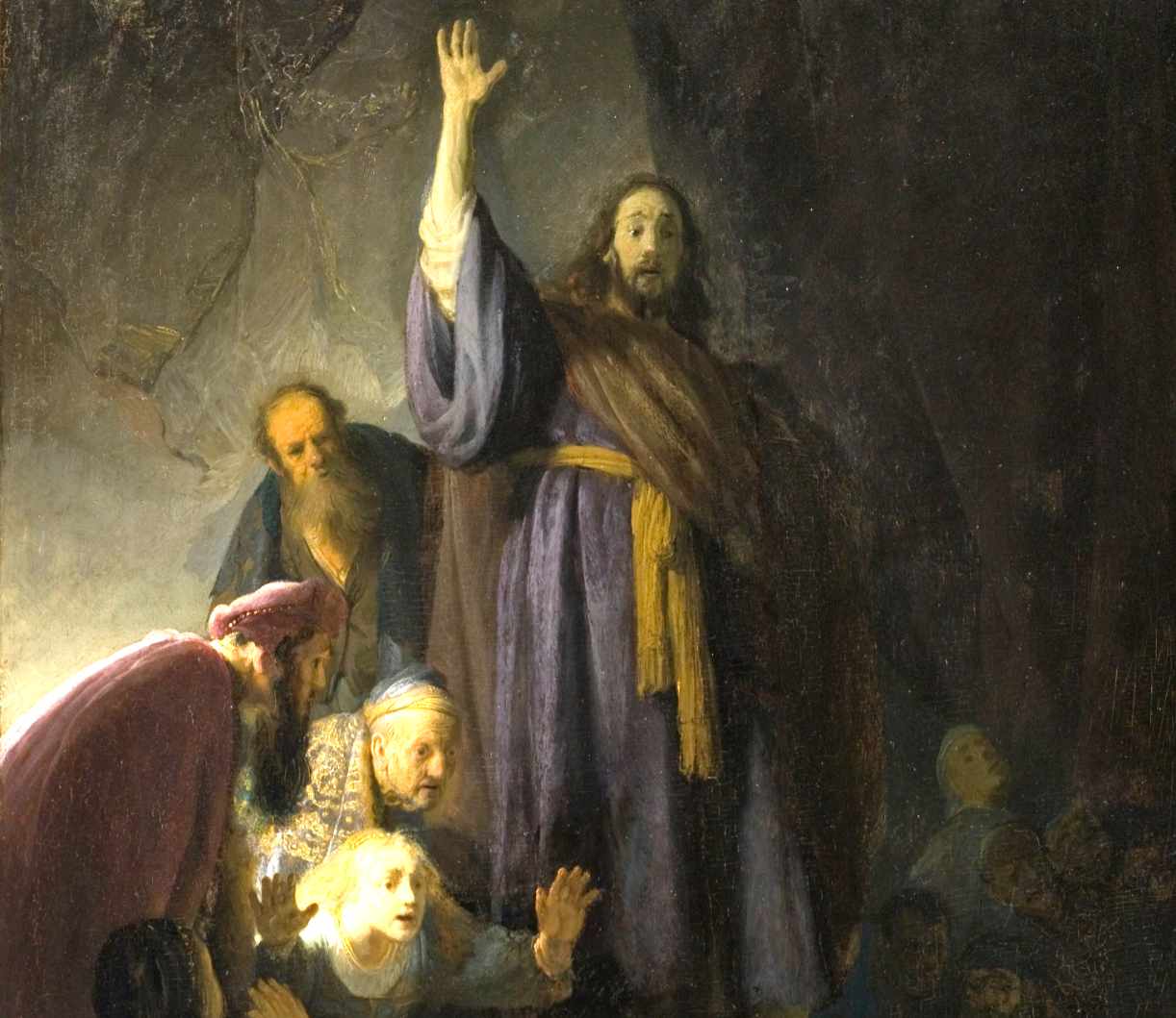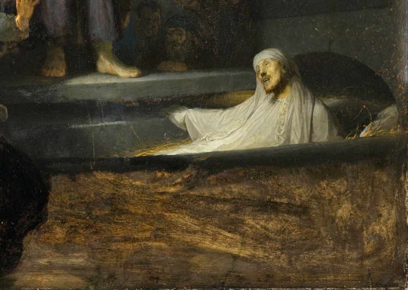 Rembrandt interpretuje powstanie Łazarza nie tylko w bezpośrednim związku z pełnym mocy gestem Chrystusa (wzniesionej ręki), ale także w odpowiedzi na boską moc, którą wyzwolił, wzbudzając wiarę. Wokół Chrystusa i grobu gromadzą się zdumieni świadkowie – między innymi Maria i Marta, siostry Łazarza – których gesty i wyraz twarzy świadczą o trwodze ale i podziwie wobec tego, co się dzieje.